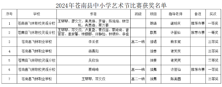 此次县艺术节大赛在丰富多样的节目里精彩纷呈的表演中圆满落幕了,充分展示了我校美育的丰硕成果,展示了艺术的传承与发展,展示了莘莘学子的艺术素养和青春风采。成功在于努力,艺术在于创造。让美在孩子们心中悄然发芽、生长。愿意气风发的艺术学子,心中有信仰,行动有力量,让青春在奋斗中闪光,让梦想在求索中开花。在未来人生的舞台更加自信、自如,让每颗星都熠熠生辉! 苍南县飞林职校灵溪分校 2024年4月24日 附图: 获奖名单