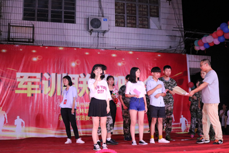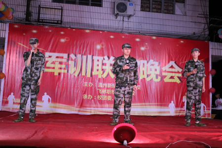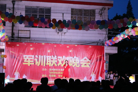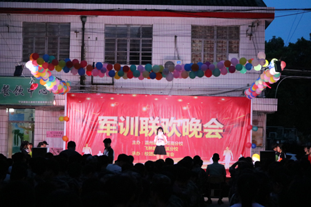 军训联欢晚会由我校学生自行组织,学校则为全体同学提供后勤工作。联欢会是同学们展现才艺,增进友谊的契机。节目形式多样化,有独唱、合唱、小品相声、街舞表演和诗歌朗诵等。也不乏根据4天军训的收获体悟改编的歌曲,可谓匠心独运,各具特色。自编自导自演的小品,以及主持人精彩的串词,伴随着掌声,笑声,在操场中飞扬。