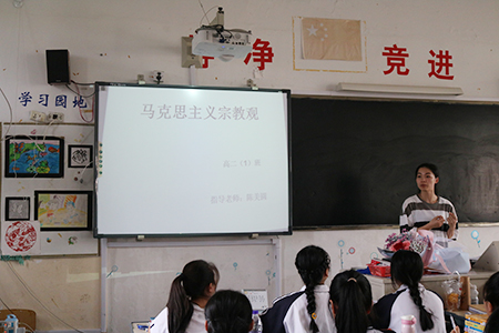 班会上,各班主任作为讲解员,以播放PPT、播放相关视频等形式,以马克思主义宗教观为指导,对学生进行宗教本质观、宗教价值观、宗教历史观、国家宗教政策法规以及宗教文化的教育。本次主题班会从宗教的本质、宗教的产生和发展、宗教存在的根源和消亡、宗教的社会作用、马克思主义政党对待宗教的基本态度和原则、树立正确的宗教观等方面深入浅出的讲解,分析宗教与邪教的区别,引导同学们以马克思主义宗教观为指导,正确看待生活中的宗教现象和问题,自觉树立马克思主义宗教观。针对学生的疑问,每位班主任都详细讲解了我国五个合法宗教与宗教信仰自由的具体内容及含义,使学生清楚地认识到在校内任何人不得以任何理由开展传教活动、举行宗教仪式、穿戴宗教服饰、宣传宗教思想,如果发现这种情况,每位师生都有义务向学校反映。