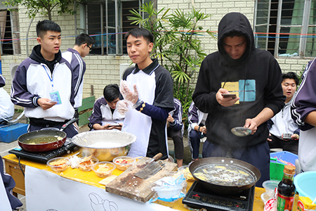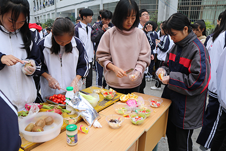 在美食节活动现场看到,当简单的食材和学生们灵巧的双手相遇时,一道道美食就悄然诞生了。学生在老师们的关注中操作,在叮嘱中体验,各小组成员分工明确,师生齐动手,共参与,你切菜来我炒菜,学生们争相秀厨艺,烹饪自己的拿手好菜,现场充斥着浓浓的香气,无不体现出学生们的认真和细致。每一道美食在“大师们”的精雕细琢与创意造型下,最终都以色香味、意形养俱佳的姿态呈现在大家眼前。整个校园都沉浸在美食节的热烈喜庆氛围中。